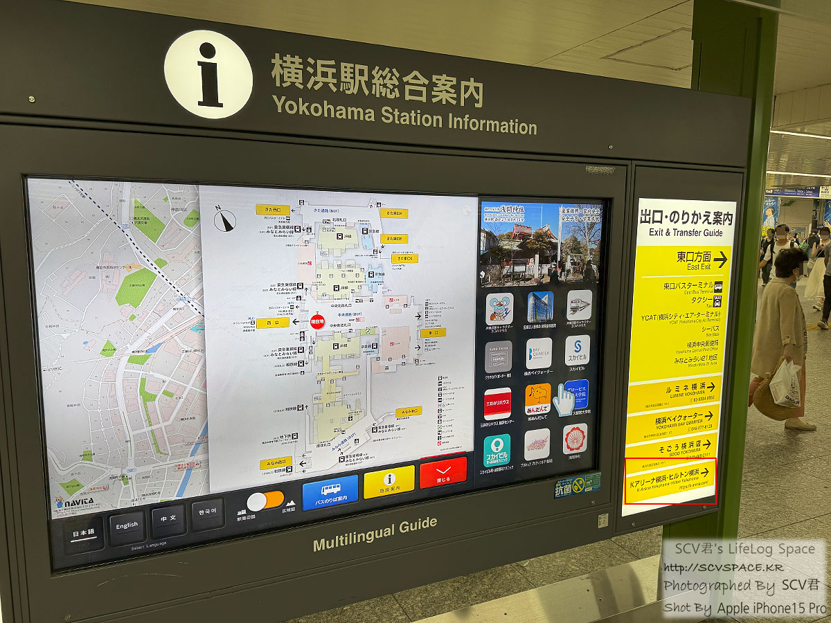 사진 정면쯤 보이실지 모르겠는데, 어느쪽으로 가면 요코하마 역과 가까운지 스탭들이 안내 팻말을 들고 서있습니다.