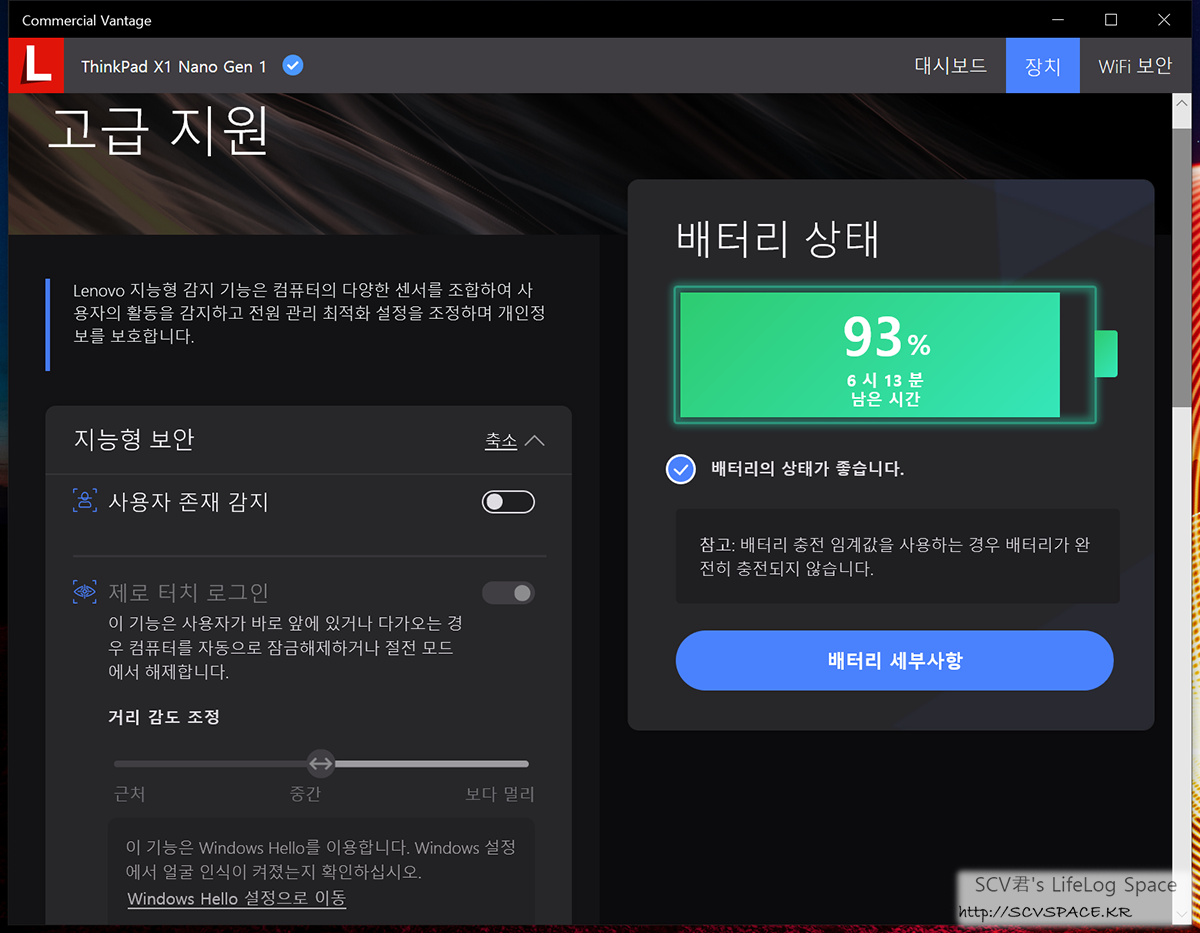 그리고 Lenovo Vantage 라는, 노트북 전용 튜닝 프로그램을 좀 더 둘러보며, 이런저런 기능들을 조정했습니다.