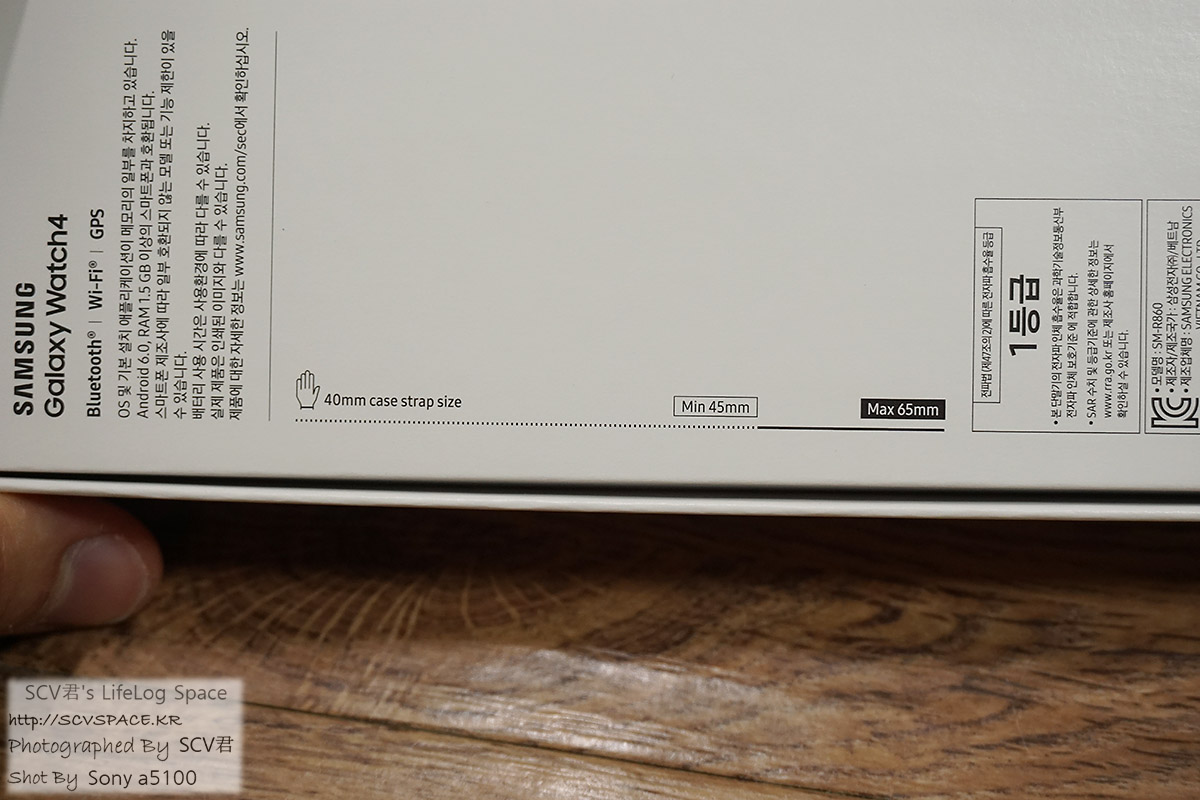 박스 뒷면에는 스펙이나 인증관련 정보들이 적혀있고, 워치의 스트랩 사이즈도 표시되어 있습니다.