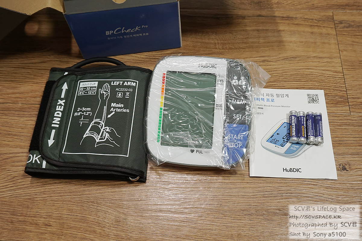 그게 이 제품. 건전지 넣고 커프를 착용한 뒤 시작을 누르면 최고/최저 혈압을 측정해 줍니다.