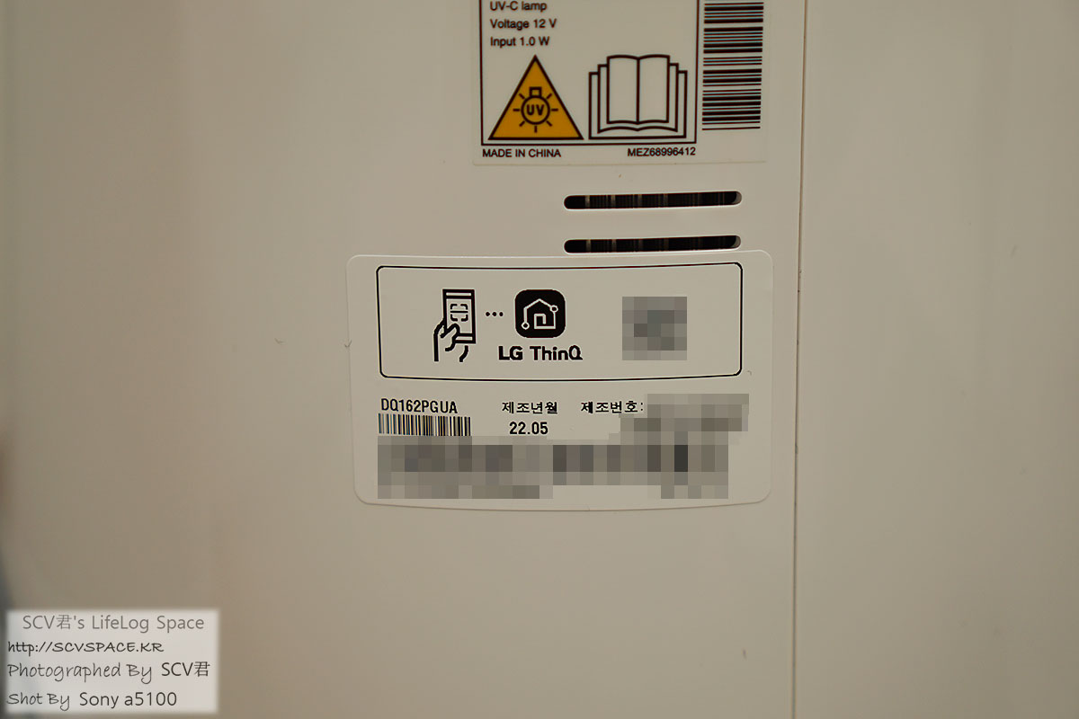 그리고 측면의 물통. 에너지 소비효율등급 스티커 뒤쪽 물통 방향으로는 LED램프도 달려있습니다. 수위확인용인 듯.