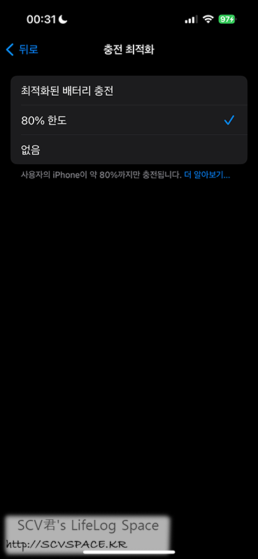 역시 아이폰15 들어서 도입된 '80% 충전 제한' 기능도 눈에 띄어 바로 적용.