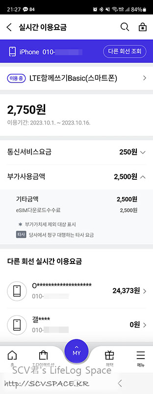 이후 함께쓰기 회선 계정을 T World에서 조회해보면 이렇게 다운로드 비용이 청구되어 있습니다.