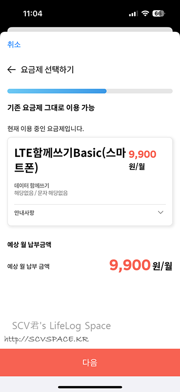 그 뒤에는 이런식으로 요금제를 확인하고(제 경우는 2회선 무료인 LTE 함께쓰기 유지) 약관동의 후 확인절차.