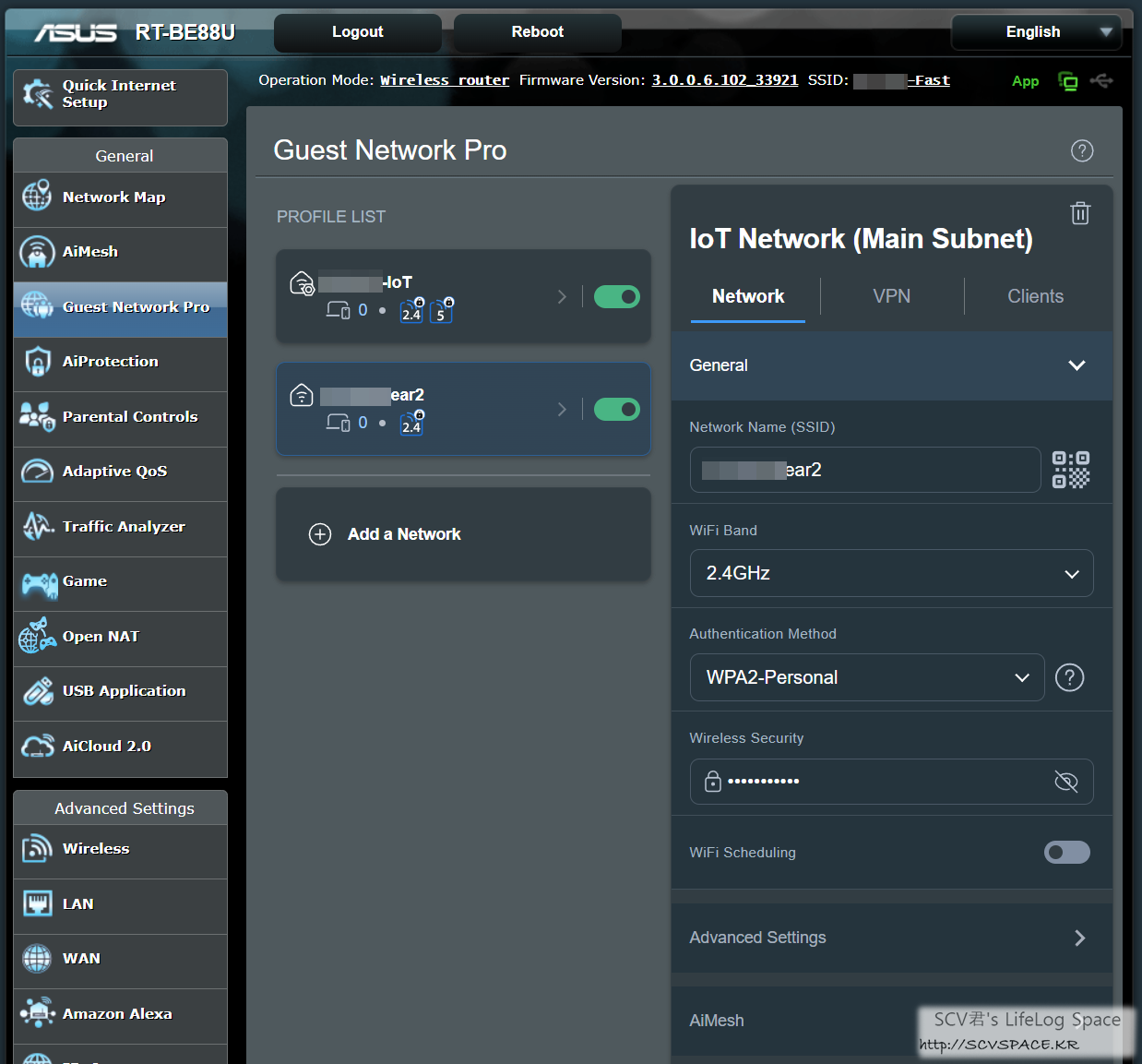아까 설정된 IoT SSID는 메인 와이파이가 아니라 이렇게 게스트 와이파이로 설정됩니다. (기존에는 왼쪽의 Wireless 메뉴에서 설정)