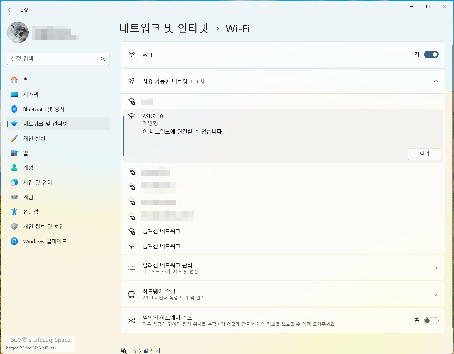 셋팅하려고 노트북에서 무선 연결을 시도하니 (당연히)거부됩니다.