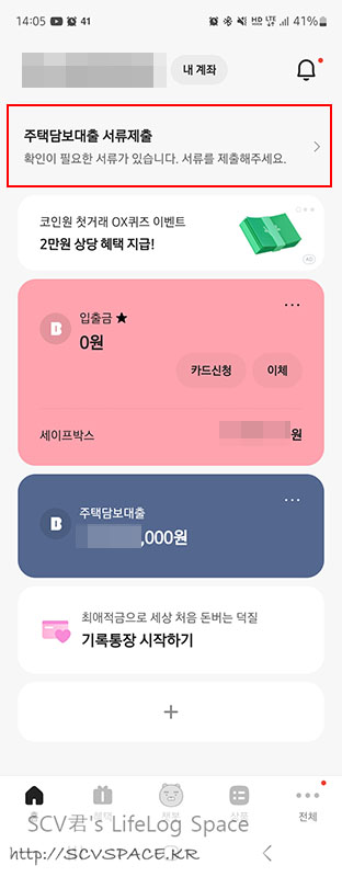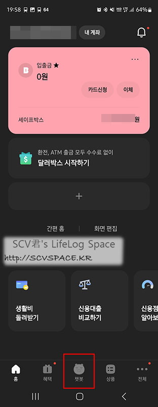 또, 일단 대출관련 처리가 시작되면 카카오뱅크 메인화면 하단에 [챗봇] 버튼이 생기고 여기서 언제든 대출관련 내용을 확인할 수 있습니다.