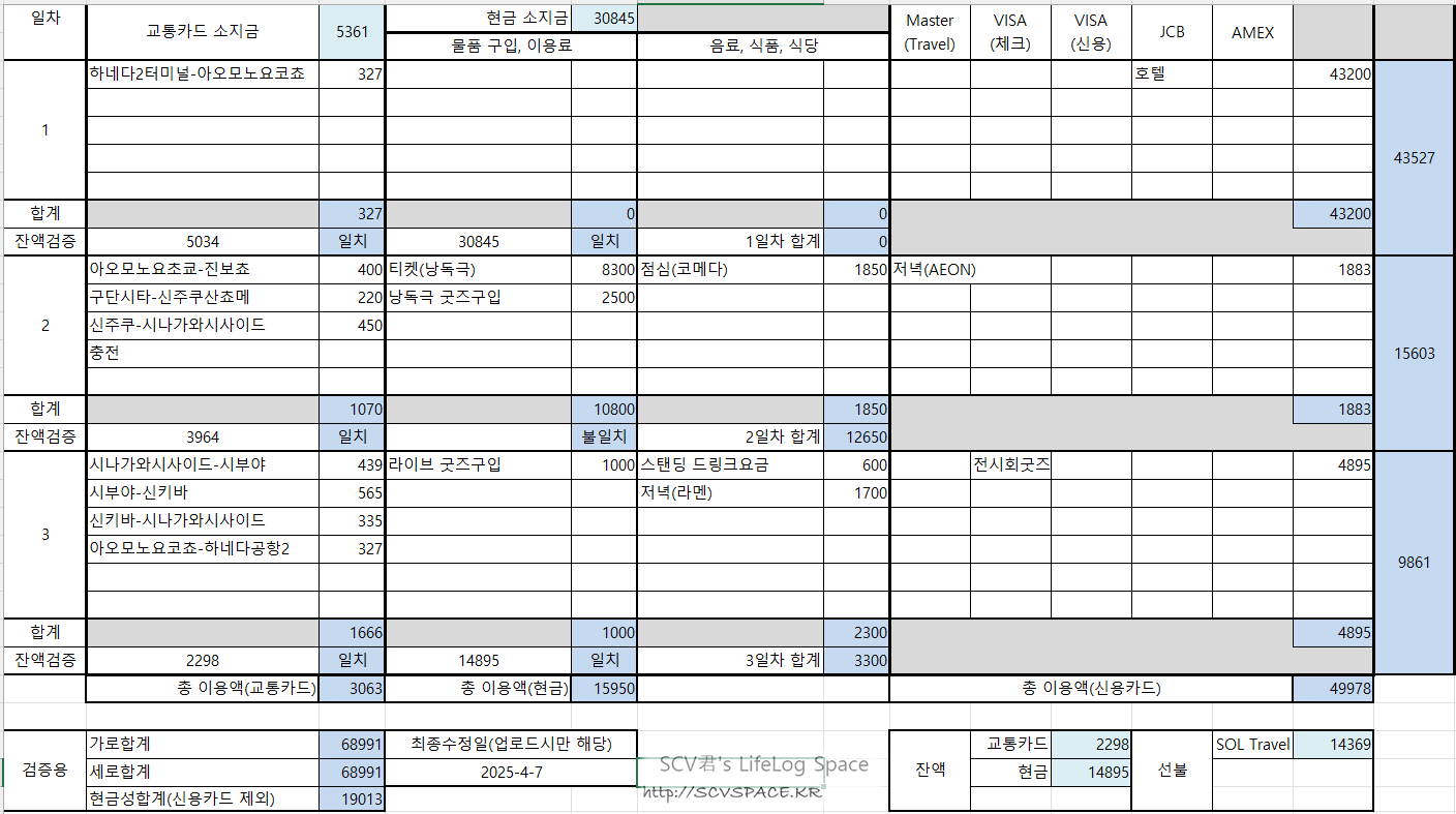 평소처럼 호텔 같은 큼지막한 지출은 카드로 해결하고, 낭독극 당일권이나 식당처럼 현금만 받는 지출 아니면 현금만 써야되는것도 아니구요.