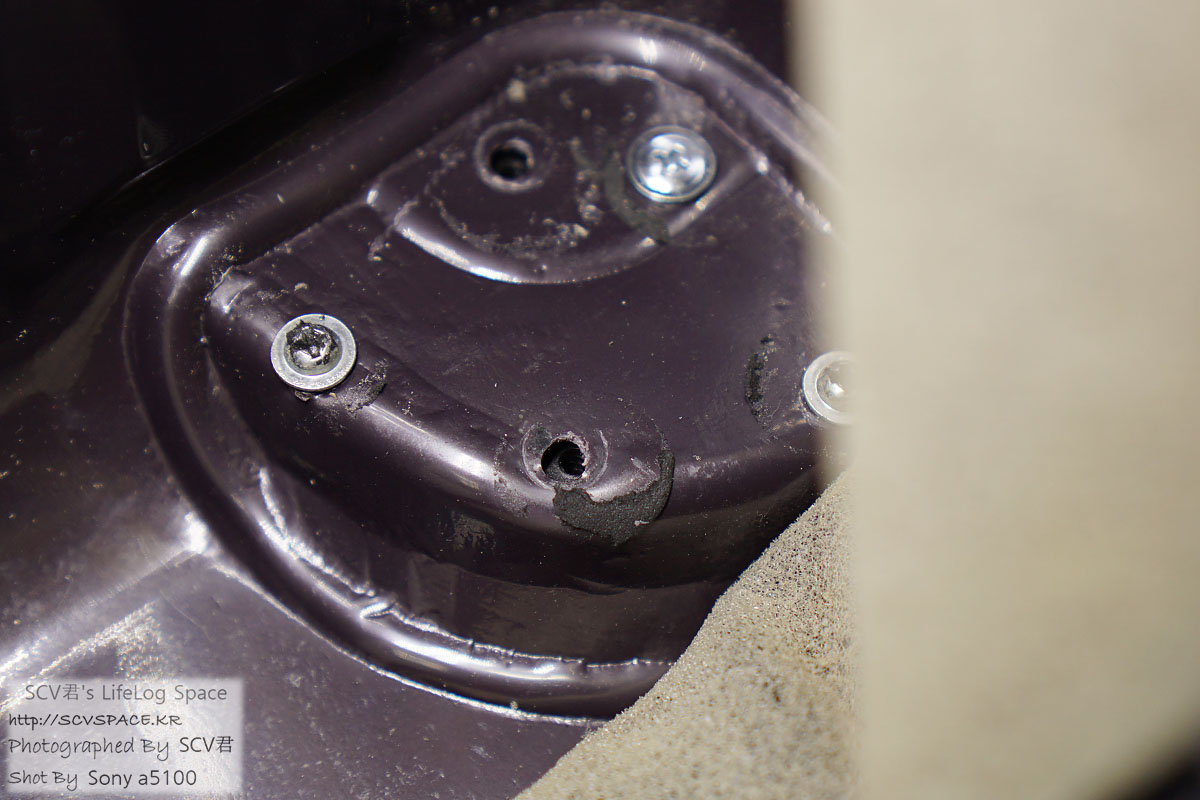 공산품처럼 딱 그 자리에 갖다 대고 조이기만 하면 되는것도 아닌게, 이렇게 몇mm의 오차가 있어서 캐리어쪽 나사구멍에서 바퀴쪽 나사구멍이 다 안보이기도 합니다.