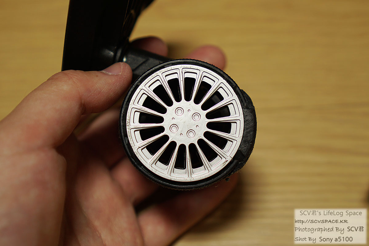 왼쪽 바퀴는 안쪽 축이 차지하는 공간이 적어서, 혹시 바퀴 머리부분이 날아가서 휠 만으로 쓰게 되더라도 안쪽의 축이 갈리진 않습니다.
