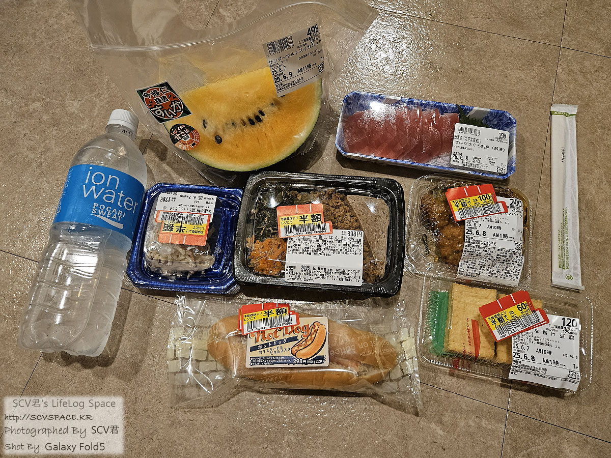 이날은 이런걸 샀습니다. 수박, 참치 빼고는 다 반액으로 산 것들. 총 1,783엔.